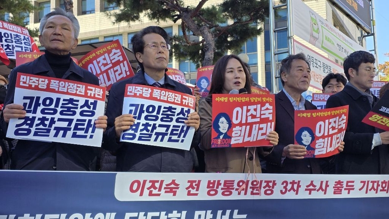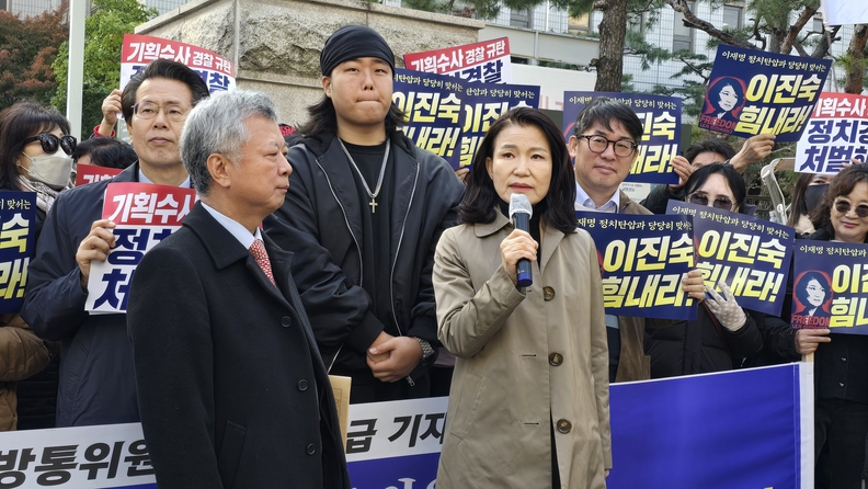 서울남부지검 앞에서 5일 오후, 일부 시민단체가 이진숙 전 방송통신위원장의 체포 과정에 절차적 위법성이 있었다는 의혹을 제기하며 검찰의 철저한 수사를 촉구했다.