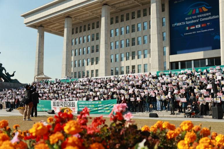 2025년 11월 12일 오후 1시 30분, 국회 본관 앞 계단에서 ‘거룩한방파제 통합국민대회’ 주최로 기자회견이 열렸다.