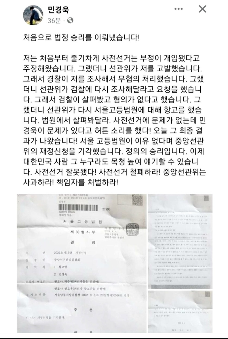 민 전 의원은 선관위가 자신의 발언이 허위사실 유포에 해당한다고 보고 고발했지만, 경찰과 검찰은 범죄 성립 요건을 충족하기 어렵다는 판단을 내렸고, 선관위의 항소 및 재정신청에 서울고등법원도 최종 기각했다고 알리며 해당 의혹 제기 발언은 형사처벌로 이어지지 않게 됐다고 말했다.