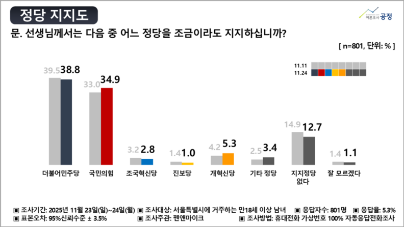 6) 서울 정당지지도 민주 38.8%·국힘 34.9% 오차범위 내