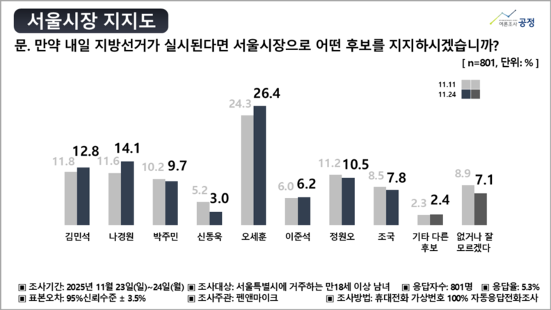 2) 서울시장 지지도, 오세훈 독주 더 강해졌다...24.3%→26.4%