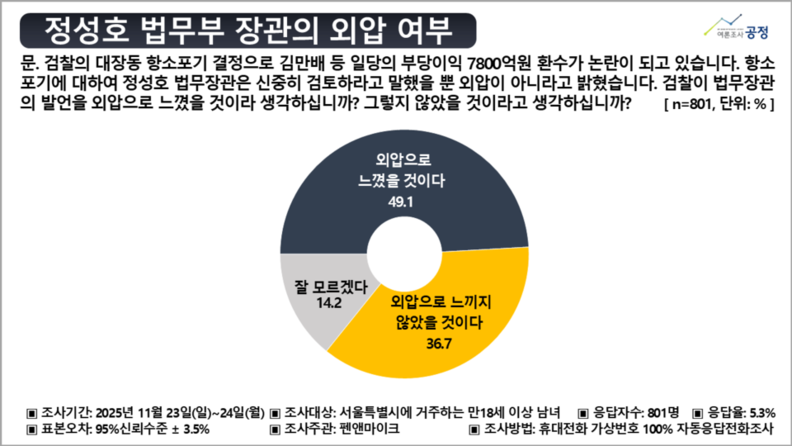 8)"정성호 '신중히 검토하라' 외압으로 느껴졌을 것" 49.1% vs "안 느껴졌을 것" 36.7%