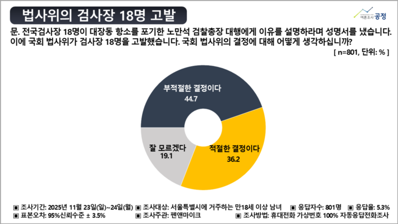 3) 국회 법사위의 검사장 18명 고발, "부적절" 44.7% vs "적절" 36.2%