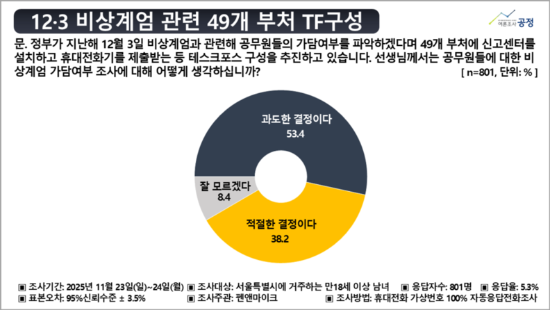5) 공무원 비상계엄 가담여부 조사, "과도한 결정" 53.4% vs "적절" 38.2%