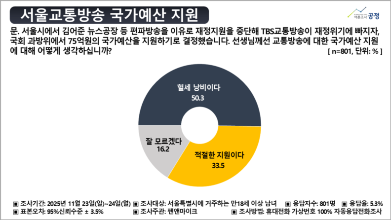 4) 국회 과방위의 TBS 75억 지원, "혈세 낭비" 50.3% vs "적절한 지원" 33.5%
