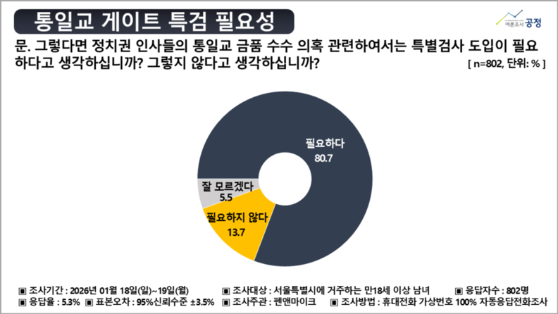 이른바 ‘통일교 게이트’로 불리는 정치권 연루 의혹과 관련해 특별검사 도입이 필요하다는 여론이 서울 전반에서 압도적으로 나타났다.