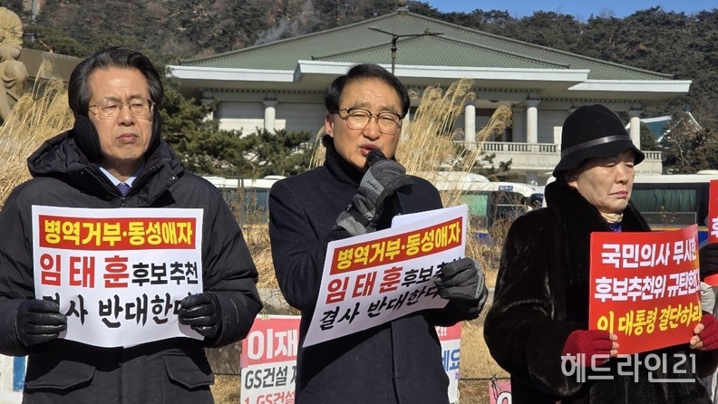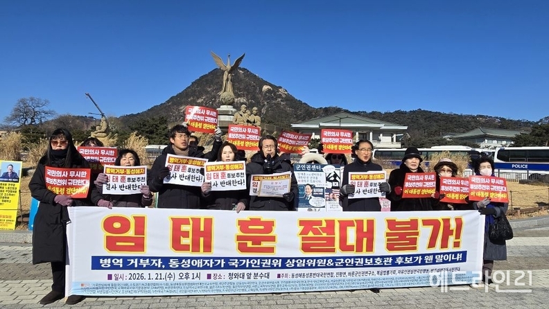 시민단체와 교계 단체들이 21일 청와대 앞 분수대에서 기자회견을 열고, 임태훈 씨가 국가인권위원회 상임위원 겸 군인권보호관 후보로 추천된 데 대해 강하게 반발하며 추천 철회를 촉구했다.