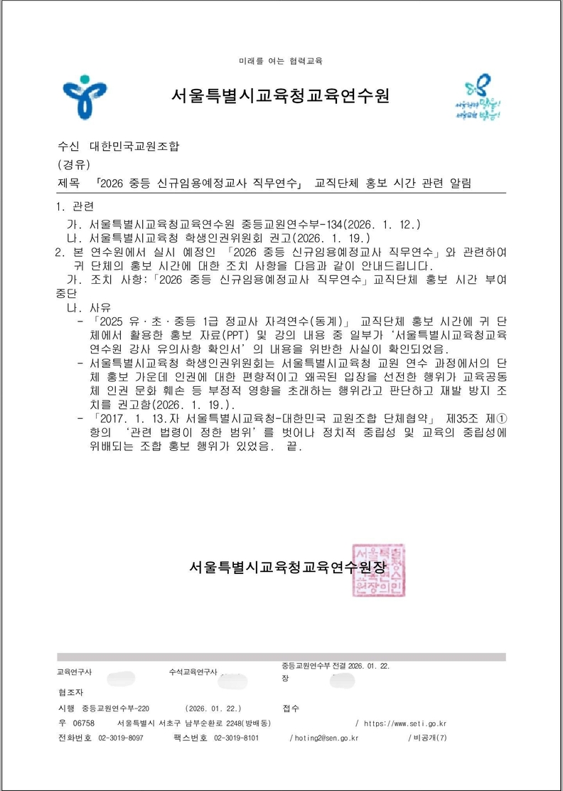 서울시교육청이 올해 1월 진행된 2026학년도 중등 신규임용예정교사 직무연수 과정에서 대한교조의 교직단체 홍보 시간을 배제한 결정과 관련해 논란이 확산되고 있다.