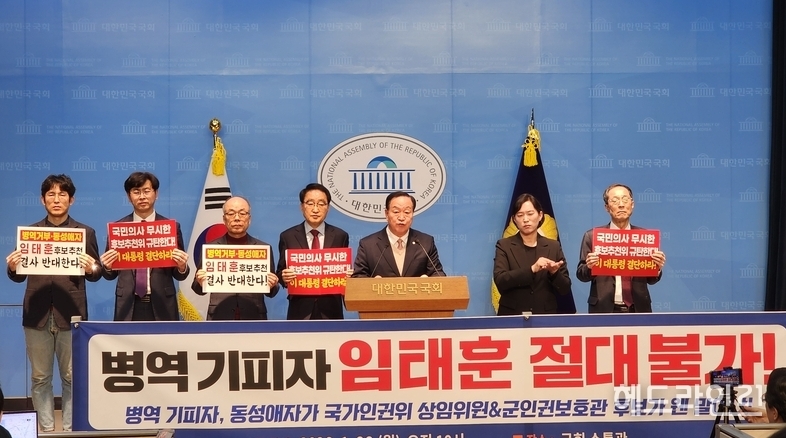 동성애동성혼반대국민연합, 진평연, 바른군인권연구소, 자유인권실천국민행동 등 시민단체들은 26일 오전 10시 국회 소통관에서 기자회견을 열고 “임태훈 씨의 인권위 상임위원 및 군인권보호관 임명은 국민 정서와 군 복무의 특수성을 외면한 인사”라며 지명 철회를 촉구했다. 이번 기자회견은 한기호 국회의원실 주최로 진행됐다.