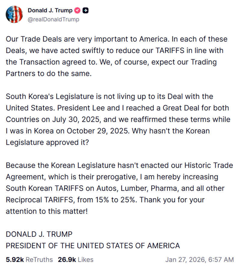 트럼프 대통령은 최근 자신의 소셜미디어 트루스소셜(Truth Social)에 올린 글을 통해 “미국은 무역 합의에 따라 관세를 신속히 인하해 왔으며, 교역 상대국도 같은 조치를 취해야 한다”고 밝혔다. 이어 “한국 입법부가 미국과의 합의를 지키지 않고 있다”며 자동차, 목재, 의약품을 포함한 모든 상호관세를 15%에서 25%로 인상하겠다고 언급했다.