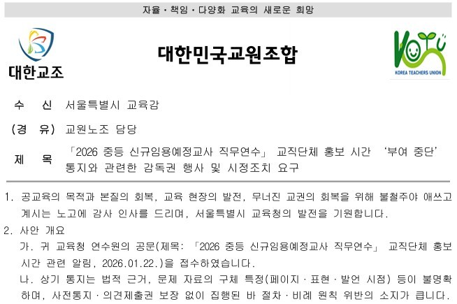 신규 임용 예정 교사를 대상으로 한 직무연수 과정에서 특정 교직단체의 홍보 시간을 중단한 조치를 두고 논란이 다시 불거지고 있다. 대한민국교원조합은 해당 조치가 절차와 근거를 갖추지 못한 채 이뤄졌다며 서울특별시교육청에 감독권 행사와 시정 조치를 공식 요청했다.