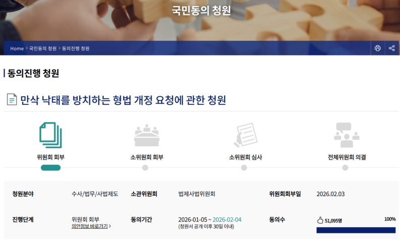 2월 2일, 국회 국민동의청원에서 5만명 동의 요건이 달성된 ‘만삭낙태 방치 형법 개정’ 청원이 정식 안건으로 성립돼 같은 날 소관 상임위원회에 회부됐다. 헌법재판소가 낙태 기준 마련을 요구한 이후에도 형법 개정이 이뤄지지 않으면서 발생한 입법 공백에 대해 시민들이 제도권 절차를 통해 문제를 제기한 것이다.