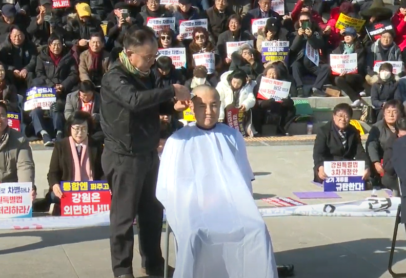 김진태 강원특별자치도지사가 9일 오후 서울 여의도 국회 본관 앞에서 열린 강원특별법 3차 개정안 처리 촉구 집회 도중 직접 삭발을 단행했다.