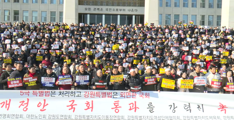 강원특별자치도 범국민추진협의회와 도내 18개 시·군 번영회 등은 이날 결의대회를 열고 도민 3,000여 명이 참여했다고 밝혔다. 참가자들은 타 지역 행정통합 관련 특별법이 비교적 신속하게 논의되는 것과 달리, 강원특별법은 상임위 문턱조차 넘지 못한 채 장기간 계류돼 있다며 강한 불만을 드러냈다.