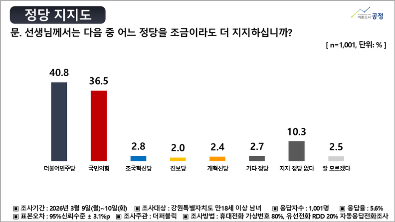 이번 조사는 여론조사 전문기관 여론조사공정(주)이 더퍼블릭의 의뢰로 지난 3월 9일부터 10일까지 이틀간 강원특별자치도 거주 만 18세 이상 남녀 1,001명을 대상으로 실시한 결과다. 무선 ARS 80%(가상번호)와 유선 ARS 20%(RDD) 방식으로 진행됐으며, 응답률은 5.6%, 표본오차는 95% 신뢰수준에서 ±3.1%p다. 통계보정은 2026년 2월 말 행정안전부 주민등록 인구통계 기준 성, 연령, 지역별 가중치(림가중)를 부여했다.