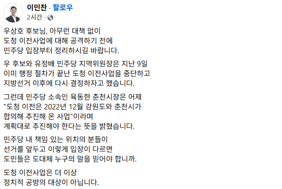 강원도청 이전 사업을 둘러싼 정치권 논쟁이 이어지는 가운데, 이민찬 전 대통령실 행정관이 더불어민주당 우상호 강원도지사 예비후보를 향해 “민주당 입장부터 정리하라”고 비판했다.