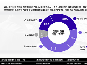 헤드라인21이 리서치제이(주)에 의뢰해 실시한 여론조사에서 이재명 대통령의 국정운영에 대한 긍정 평가는 50.6%, 부정 평가는 44.5%로 나타났다. 세부 응답을 보면 ‘매우 잘하고 있다’는 평가가 38.9%, ‘잘하는 편이다’는 11.7%였다. 반면 ‘매우 잘못하고 있다’는 응답도 35.9%에 달했고, ‘잘못하는 편이다’는 8.7%로 집계됐다. 중간 평가보다는 강한 긍·부정 인식이 동시에 높은 구조로 나타났다. 지역별로는 호남권에서 긍정 평가가 상대적으로 높았고, 대구·경북과 부산·울산·경남에서는 부정 평가 비중이 긍정 평가를 앞섰다. 수도권에서는 긍·부정 평가가 비교적 비슷한 수준으로 분포했다. 연령별로는 50대 이상에서 긍정 평가가 상대적으로 높았던 반면, 20·30대에서는 부정 평가 비중이 더 컸다. 성별로는 남녀 간 큰 격차는 없었으나 여성 응답자에서 부정 평가 비율이 다소 높게 나타났다. 리서치제이(주) 이배인 대표는 “지지율이 과반이 50.6%에서 횡보하는 모양새를 보이는 것은 중국방문에 따른 가시적 성과 미흡과 관련이 있는 것을 보인다. 매우 잘하고 있다고 평가한 38.9%는 핵심지지층으로 볼 수 있지만, 35.9%는 매우못한다고 평가하고 있