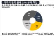 미국의 한국산 제품에 대한 25% 관세 부과를 둘러싸고, 그 책임이 현 정부와 여당에 있다는 인식이 과반을 넘는다는 여론조사 결과가 나왔다. 야당 책임을 묻는 응답도 적지 않았지만, 정부와 여당을 함께 지목한 응답이 가장 높은 비중을 차지하면서 외교·통상 대응에 대한 평가가 냉정해지고 있다는 해석이 나온다. 펜앤마이크가 여론조사 전문기관 여론조사공정(주)에 의뢰해 지난 1일과 2일 이틀간 전국에 거주하는 만 18세 이상 남녀 1천명을 대상으로 미국의 25% 관세 부과 책임이 누구에게 있는지를 물은 결과, 정부 책임이라는 응답이 32.2%로 가장 높았다. 여당 책임은 21.4%, 야당 책임은 26.1%로 나타났으며, 잘 모르겠다는 응답은 20.3%였다. 정부와 여당 책임을 합산하면 53.6%에 달해, 응답자 과반이 현 집권 세력의 대응에 문제가 있다고 인식하고 있는 셈이다. 대외 통상 환경의 악화 속에서 정부의 외교력과 협상 전략에 대한 불신이 반영된 결과로 풀이된다. 지역별로 보면 수도권과 영남권을 중심으로 정부 책임론이 상대적으로 높았다. 서울에서는 정부 28.2%, 여당 24.9%, 야당 25.4%로 세 응답이 비슷하게 분포됐고, 경기·인천에서는 정부 책
