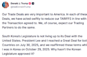 도널드 트럼프 미국 대통령이 한국을 상대로 상호관세를 기존 15%에서 25%로 인상하겠다고 공개 경고하면서 한미 통상 관계에 긴장이 고조되고 있다. 이번 경고는 한국 국회가 미·한 무역 합의를 승인하지 않았다는 점을 직접적인 인상 이유로 지목했다는 점에서 파장이 커지고 있다. 트럼프 대통령은 최근 자신의 소셜미디어 트루스소셜(Truth Social)에 올린 글을 통해 “미국은 무역 합의에 따라 관세를 신속히 인하해 왔으며, 교역 상대국도 같은 조치를 취해야 한다”고 밝혔다. 이어 “한국 입법부가 미국과의 합의를 지키지 않고 있다”며 자동차, 목재, 의약품을 포함한 모든 상호관세를 15%에서 25%로 인상하겠다고 언급했다. 해당 게시글에서 트럼프 대통령은 2025년 7월 30일 체결된 한미 무역 합의와 같은 해 10월 방한 당시 합의 조건을 재확인했다고 설명하며, “왜 한국 국회는 이 합의를 승인하지 않았는가”라고 공개적으로 문제를 제기했다. 로이터통신은 트럼프 대통령의 이번 발언이 무역 합의 이행 지연에 대한 불만을 직접적으로 드러낸 것이라고 전했다. AP통신 역시 트럼프 대통령이 한국의 무역 합의 이행 조치를 문제 삼아 관세 인상을 위협했다고 보도했다. A
