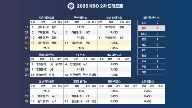 지난 11월 19일 KBO가 비공개로 진행한 2025년 2차 드래프트에서는 보호선수 35명을 제외한 각 구단의 소속선수·육성선수·군보류선수·육성군보류선수가 대상으로 총 17명이 지명되며, 시즌 전력 구도에 적지 않은 변화가 예고됐다. 1라운드 양도금 4억 원, 2라운드 3억 원, 3라운드 2억 원으로 설정된 지명 구조 속에서 구단들은 로스터 조정과 즉시 전력 보강 사이에서 치열한 계산을 주고받았고, 특히 다수의 베테랑들이 보호선수 명단에서 제외되면서 팀을 옮기는 모습이 두드러졌다.