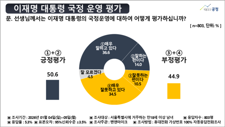 이재명의 국정운영에 대해 긍정 평가는 50.6%, 부정 평가는 44.9%로 집계됐다.