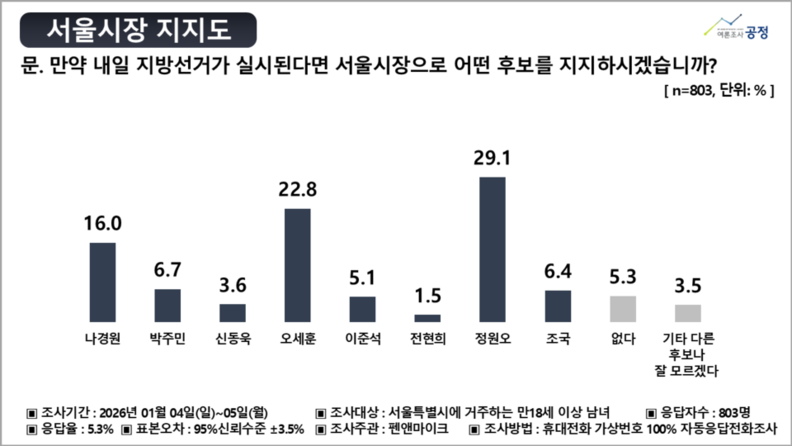 차기 서울시장 다자대결 조사에서는 정원오가 29.1%로 선두에 올랐고, 오세훈은 22.8%로 뒤를 이었다.