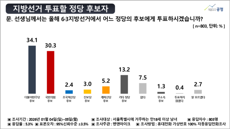 지방선거 정당 투표 의향 조사에서는 더불어민주당 34.1%, 국민의힘 30.3%로 오차범위 내 접전 양상을 보였다.