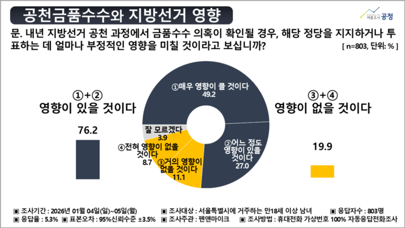 지방선거 공천 과정에서 금품수수 의혹이 사실로 확인될 경우, 해당 정당에 대한 지지나 투표에 영향을 미칠 것이라는 응답은 76.2%에 달했다.