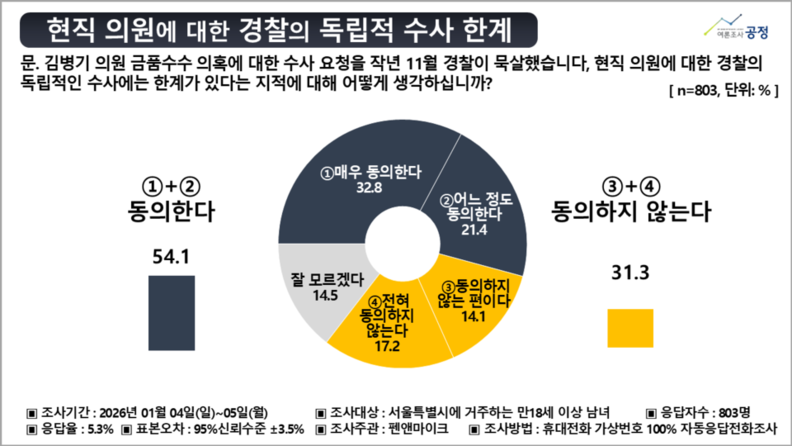 현직 국회의원에 대한 경찰 수사가 구조적으로 한계가 있다는 지적에 54.1%가 동의했다. 동의하지 않는다는 응답은 31.3%였다.