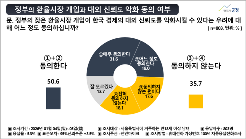 정부의 반복적인 환율시장 개입에 대해 한국 경제의 대외 신뢰도를 악화시킬 수 있다는 데 동의한 응답은 50.6%였다. 동의하지 않는다는 응답은 35.7%로 집계됐다.