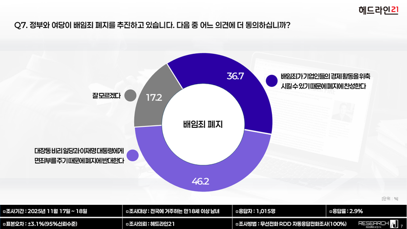 헤드라인21이 리서치제이에 의뢰해 11월 17~18일 실시한 여론조사에서, 배임죄 폐지 논의는 국민 의견이 명확히 양분된 것으로 나타났다. 응답자 가운데 46.2%는 폐지에 반대했고, 36.7%는 찬성, 17.2%는 잘 모르겠다고 답했다.