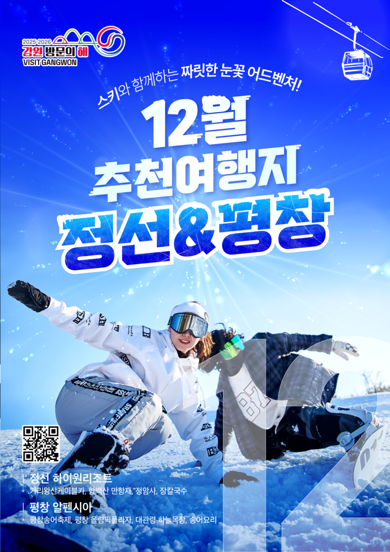 강원특별자치도와 강원관광재단이 ‘2025-2026 강원 방문의 해’ 12월 추천 여행지로 정선군과 평창군을 선정하고 본격적인 겨울 관광 홍보에 나선다. 스키 개장 시즌에 맞춰 정선의 하이원리조트와 평창 알펜시아를 중심으로 겨울 레저 관광객 유치를 확대할 계획이다.
