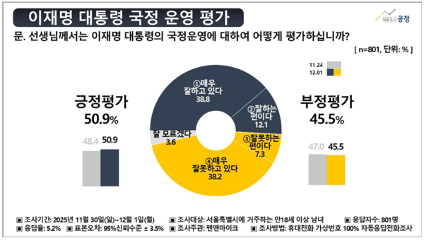 7) 서울시민 李 국정운영평가, 긍정 50.9% vs 부정 45.5%
