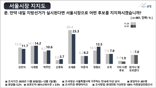 6) 서울시장 지지도, 오세훈 3.1%p 하락해 23.3% vs 정원오 3.0%p 올라 13.5%..