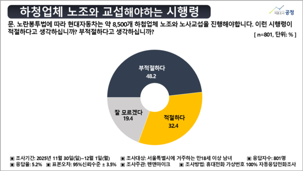 4) '하청업체 노조 교섭' 노란봉투법 시행령 "부적절" 48.2% vs "적절" 32.4%