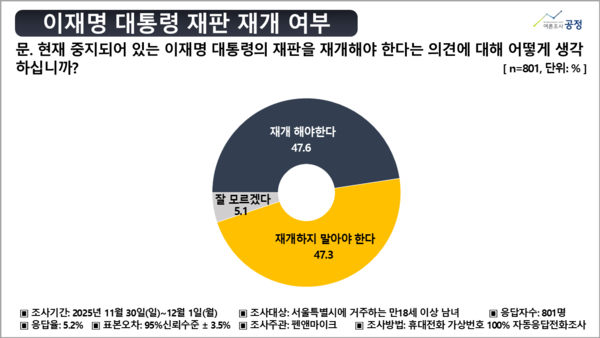 5) 이재명 재판 재개에 "동의" 47.6% vs "비동의" 47.3%...20·30·70대 동의 '과반'