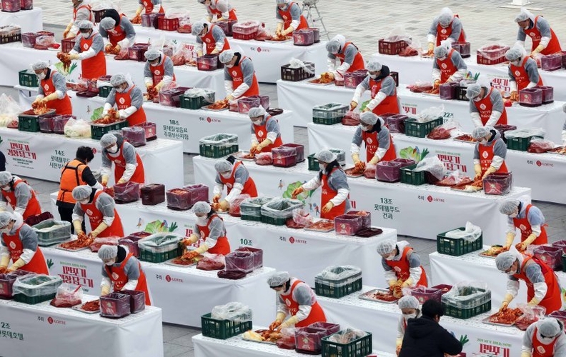 부산시와 롯데그룹이 3일 오전 사직야구장 앞 광장에서 ‘2025년 롯데 사랑나눔 프로젝트 1만 포기 김장 담그기’ 행사를 열고 부산지역 취약계층 겨울나기를 위한 대규모 나눔 활동을 진행했다.