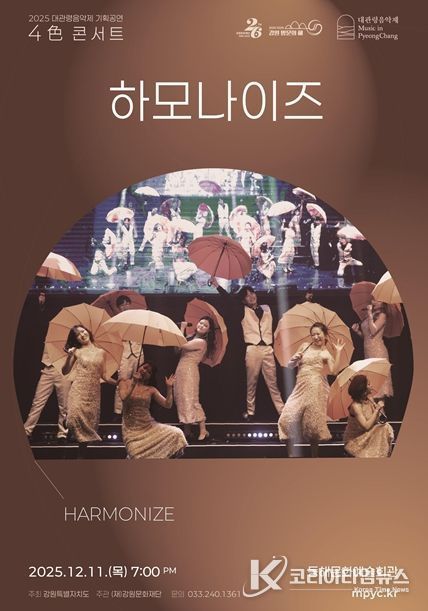 대관령음악제의 연말 기획무대인 ‘4색 콘서트’가 오는 11일 오후 7시 동해문화예술회관에서 올해 마지막 공연을 선보인다. 강원문화재단은 이번 무대에 국내 최고 쇼콰이어 그룹으로 꼽히는 ‘하모나이즈’를 초청해 다채로운 음악 퍼포먼스를 준비했다고 밝혔다.