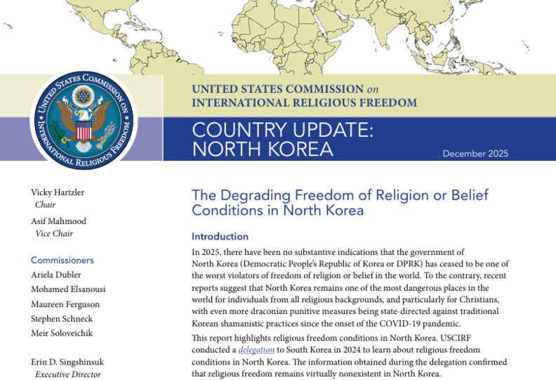 USCIRF는 올해 3월 발표한 2025년 연례보고서와 12월 4일 공개된 ‘북한 국가 업데이트’ 자료에서 북한을 “종교의 자유를 전면적으로 부정하는 대표적 전체주의 국가”로 규정했다. 보고서는 북한이 기독교를 비롯한 모든 형태의 신앙 활동을 체제 위협으로 간주하며, 종교와 관련된 어떤 행위도 감시·처벌의 대상이 되고 있다고 지적했다.