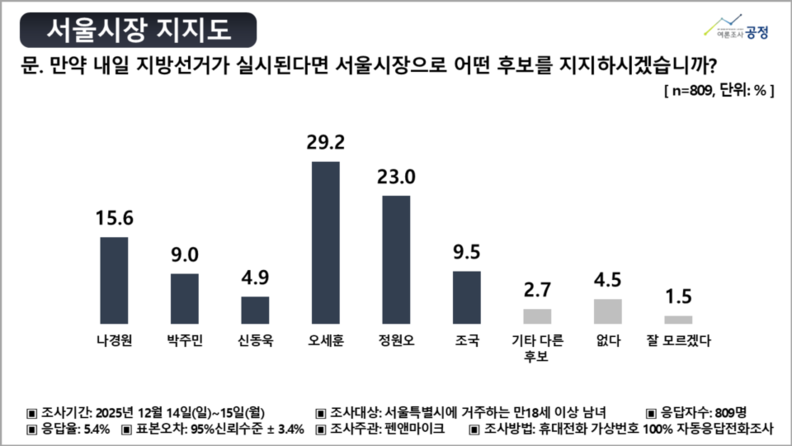 4) 서울시장 지지도 오세훈 29.2% vs 정원오 23.0%...6.2%p차
