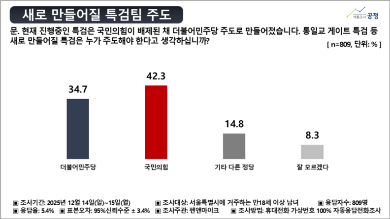 2) "새 특검, 국민의힘 주도해야" 42.3% vs "민주당 주도" 34.7%...7.6%p 오차범위 밖 차