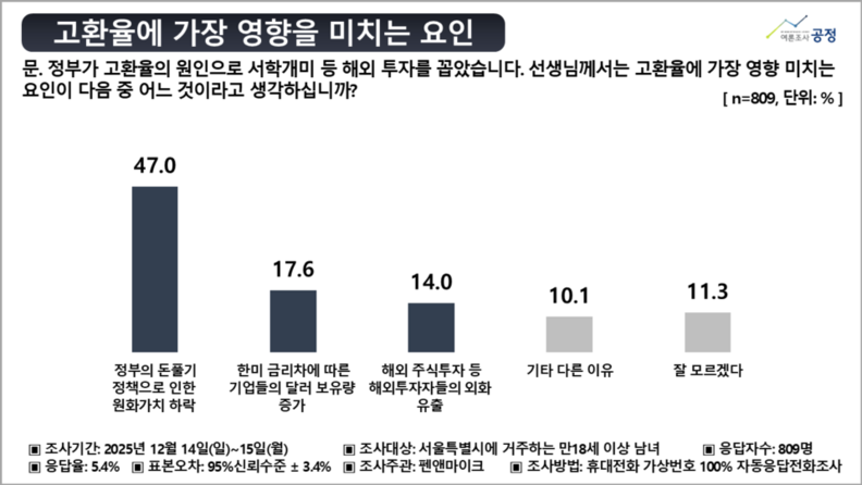 3) 고환율 원인 압도적 1위 "정부 돈풀기로 원화가치 하락" 47.0%...2위와 29.4%p차