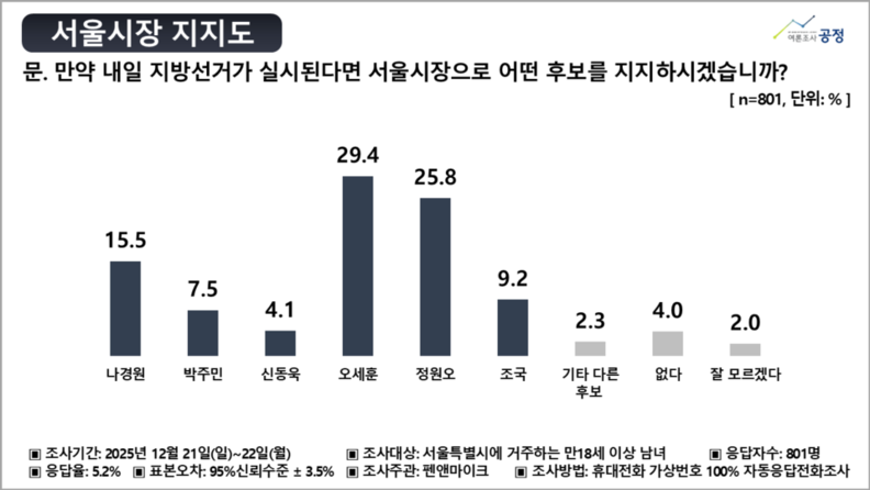 서울 시민을 대상으로 한 차기 서울시장 지지도 조사에서 오세훈 현 시장이 29.4%로 가장 높은 지지를 얻은 가운데, 정원오 성동구청장이 25.8%로 뒤를 바짝 추격하는 것으로 나타났다.