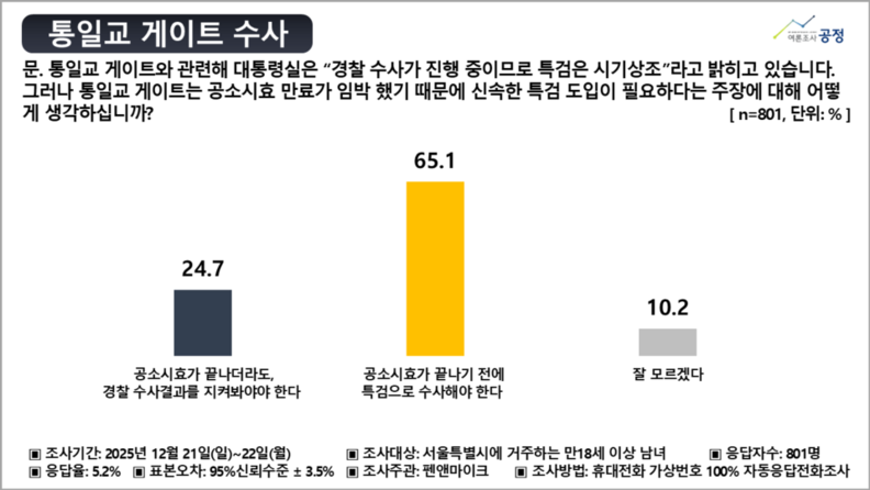 5) “‘통일교 게이트’ 특검 수사” 65.1%....“경찰 수사결과 우선” 24.7% 불과