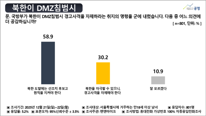 펜앤마이크가 여론조사공정에 의뢰해 실시한 여론조사 결과에 따르면, 서울 시민의 58.9%는 군이 ‘선조치 후보고’ 원칙을 유지해야 한다고 응답했다. ‘북한을 자극할 수 있으니 경고사격을 자제해야 한다’는 응답은 30.2%에 그쳤다.
