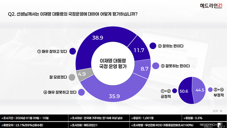 헤드라인21이 리서치제이(주)에 의뢰해 실시한 여론조사에서 이재명 대통령의 국정운영에 대한 긍정 평가는 50.6%, 부정 평가는 44.5%로 나타났다.