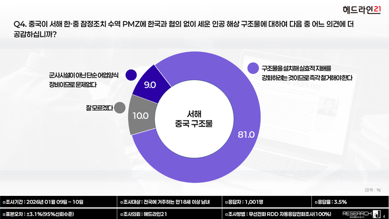 헤드라인21이 리서치제이(주)에 의뢰해 실시한 여론조사에서 중국이 서해 PMZ 인근에 설치한 인공 해상 구조물에 대해 ‘즉각 철거해야 한다’는 응답이 81.0%로 나타났다.