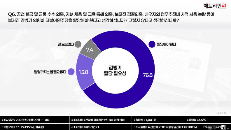 헤드라인21이 리서치제이(주)에 의뢰해 실시한 여론조사에서 김병기 의원에 대해 ‘탈당해야 한다’는 응답이 76.8%로 나타났다.