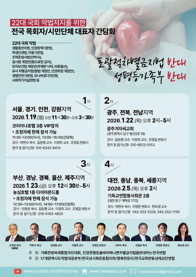 이번 간담회는 서울·경기·인천·강원 지역을 시작으로 전국 4개 권역을 순회하며 진행되는 첫 일정이다. 주최 측은 이를 단순한 정보 공유를 넘어, 교회와 가정의 근간을 흔들 수 있는 입법 시도에 맞선 전국적 연대 행동의 출발점으로 규정했다.