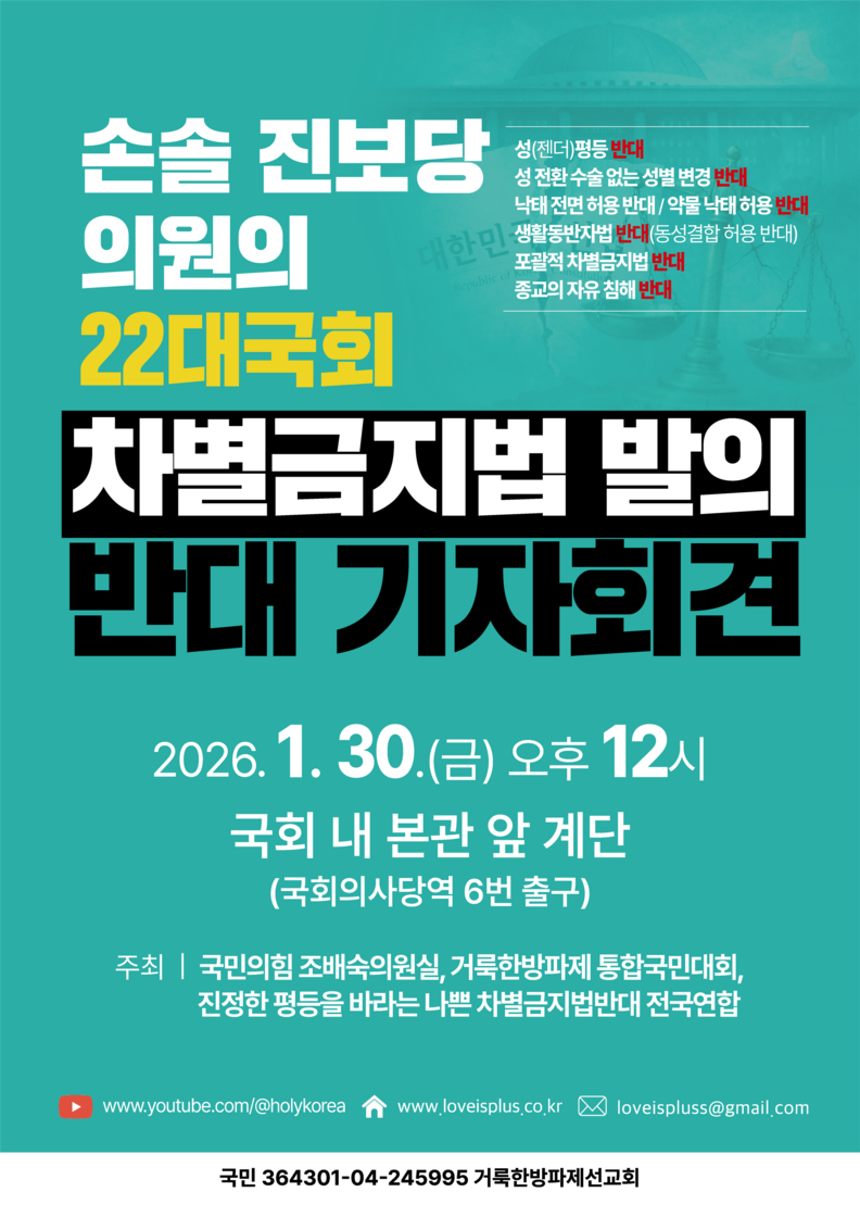 한편 주최 측은 오는 1월 30일 정오, 국회 본관 앞 계단에서 차별금지법 발의에 반대하는 대규모 기자회견을 열고 악법 저지 행동에 나설 계획이다.